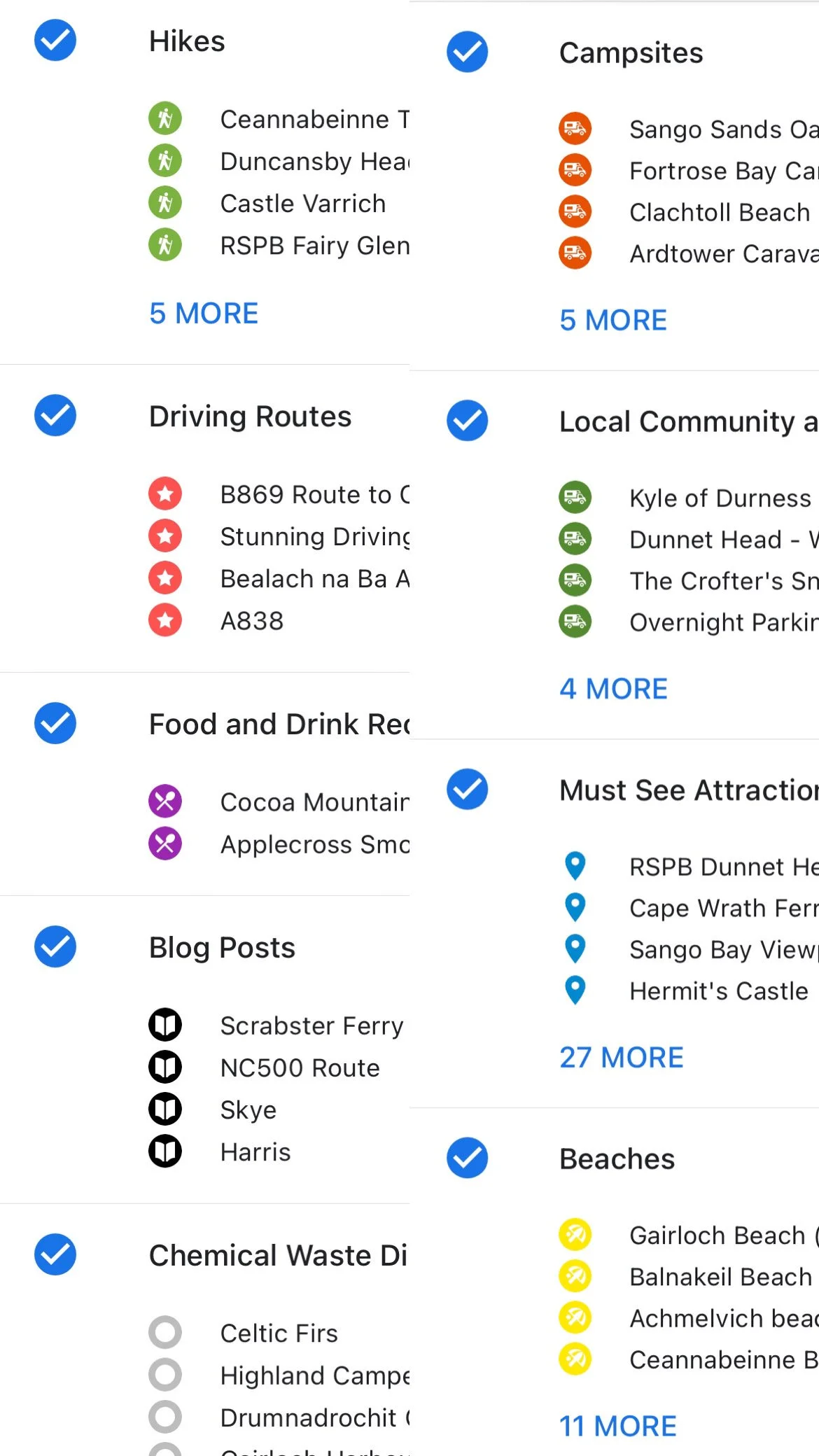 Campsite recommendations, overnight parking/ community wild camping spots, chemical disposal points, must see attractions and towns, beaches, hikes, food and drink recommendations, driving routes and blog post links.
